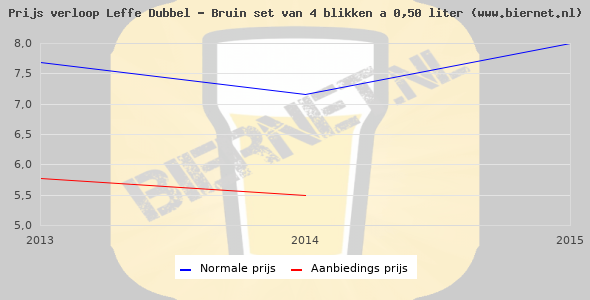 De gemiddelde prijs van een set van 4 blikken á 0,50 liter van Leffe Bruin is niet bekend. De gemiddelde prijs van Leffe Bruin in de winkel is niet bekend.