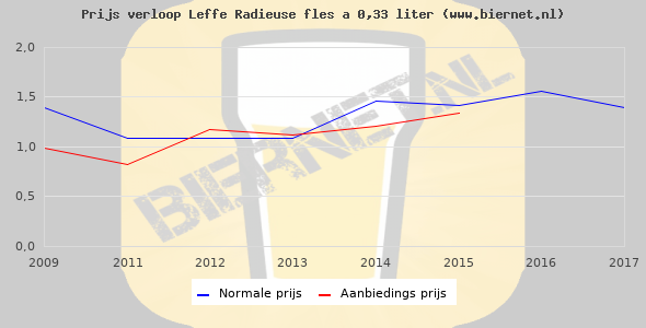 De gemiddelde prijs van een fles á 0,33 liter van Leffe Radieuse is niet bekend. De gemiddelde prijs van Leffe Radieuse in de winkel is niet bekend.