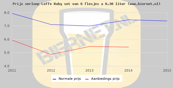 De gemiddelde prijs van een set van 6 flesjes á 0,30 liter van Leffe Ruby is €8,37 (€4,65 per liter). De gemiddelde prijs van Leffe Ruby in de winkel is €4,80 per liter.