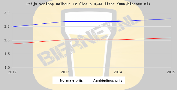 De gemiddelde prijs van een fles á 0,33 liter van Malheur 12 is €3,75 (€11,36 per liter). De gemiddelde prijs van Malheur 12 in de winkel is €11,36 per liter.