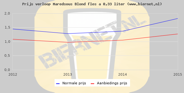 De gemiddelde prijs van een fles á 0,33 liter van Maredsous Blond is €2,37 (€7,18 per liter). De gemiddelde prijs van Maredsous Blond in de winkel is €6,79 per liter.