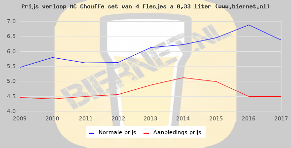 De gemiddelde prijs van een set van 4 flesjes á 0,33 liter van MC Chouffe is niet bekend. De gemiddelde prijs van MC Chouffe in de winkel is niet bekend.