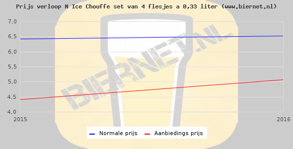 De gemiddelde prijs van een set van 4 flesjes á 0,33 liter van N'ice Chouffe is €10,04 (€7,61 per liter). De gemiddelde prijs van N'ice Chouffe in de winkel is €8,41 per liter.