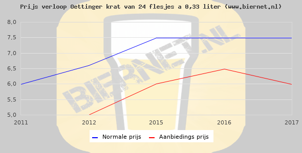 De gemiddelde prijs van een krat van 24 flesjes á 0,33 liter van Oettinger is niet bekend. De gemiddelde prijs van Oettinger in de winkel is niet bekend.