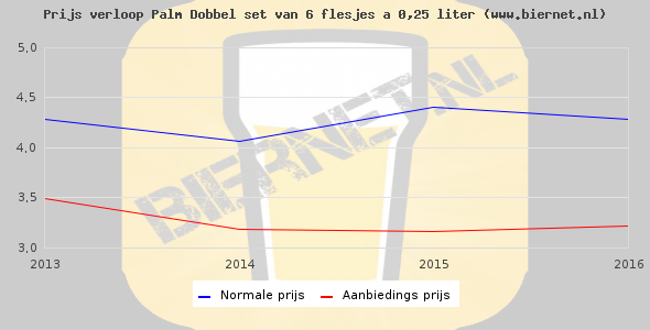 De gemiddelde prijs van een set van 6 flesjes á 0,25 liter van Palm Dobbel is niet bekend. De gemiddelde prijs van Palm Dobbel in de winkel is niet bekend.