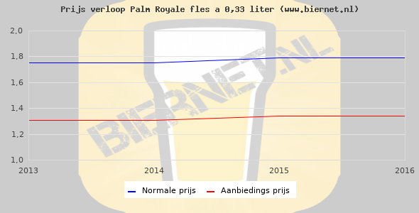 De gemiddelde prijs van een fles á 0,33 liter van Palm Royale is niet bekend. De gemiddelde prijs van Palm Royale in de winkel is niet bekend.