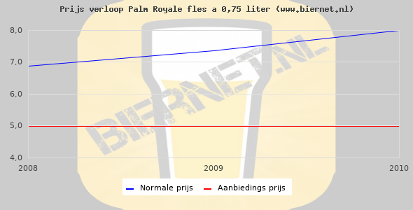 De gemiddelde prijs van een fles á 0,75 liter van Palm Royale is niet bekend. De gemiddelde prijs van Palm Royale in de winkel is niet bekend.