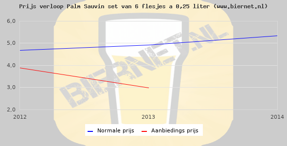 De gemiddelde prijs van een set van 6 flesjes á 0,25 liter van Palm Sauvin is niet bekend. De gemiddelde prijs van Palm Sauvin in de winkel is niet bekend.