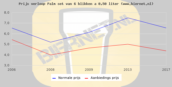 De gemiddelde prijs van een set van 6 blikken á 0,50 liter van Palm Spéciale is niet bekend. De gemiddelde prijs van Palm Spéciale in de winkel is niet bekend.