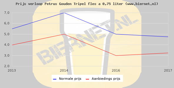 De gemiddelde prijs van een fles á 0,75 liter van Petrus Gouden Tripel is niet bekend. De gemiddelde prijs van Petrus Gouden Tripel in de winkel is niet bekend.
