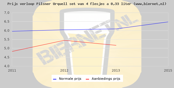 De gemiddelde prijs van een set van 4 flesjes á 0,33 liter van Pilsner Urquell is €5,99 (€4,54 per liter). De gemiddelde prijs van Pilsner Urquell in de winkel is €6,74 per liter.