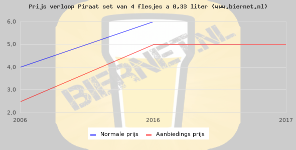 De gemiddelde prijs van een set van 4 flesjes á 0,33 liter van Piraat Tripel Hop is niet bekend. De gemiddelde prijs van Piraat Tripel Hop in de winkel is niet bekend.