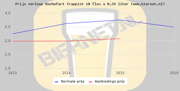 De gemiddelde prijs van een fles á 0,33 liter van Rochefort Trappist 10 is €3,6 (€10,91 per liter). De gemiddelde prijs van Rochefort Trappist 10 in de winkel is €10,82 per liter.