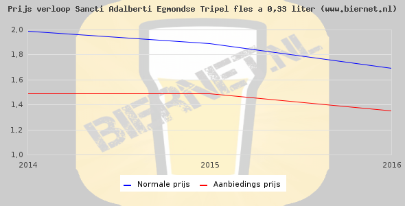 De gemiddelde prijs van een fles á 0,33 liter van Sancti Adalberti Egmondse Tripel is €3,02 (€9,15 per liter). De gemiddelde prijs van Sancti Adalberti Egmondse Tripel in de winkel is €9,35 per liter.