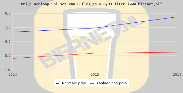 De gemiddelde prijs van een set van 6 flesjes á 0,33 liter van Sol is niet bekend. De gemiddelde prijs van Sol in de winkel is niet bekend.