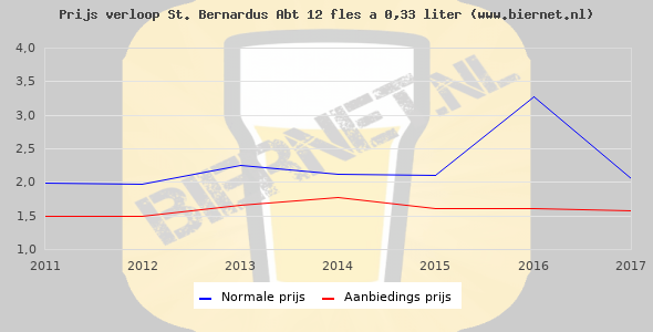 De gemiddelde prijs van een fles á 0,33 liter van St. Bernardus Abt 12 is €2,75 (€8,33 per liter). De gemiddelde prijs van St. Bernardus Abt 12 in de winkel is €19,53 per liter.