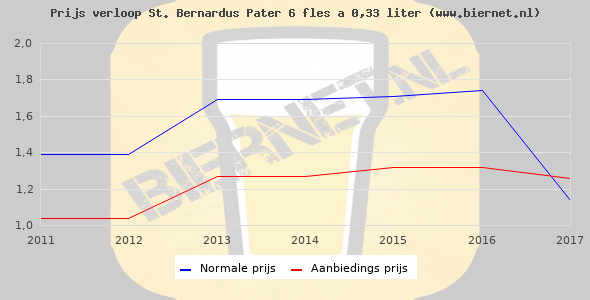 De gemiddelde prijs van een fles á 0,33 liter van St. Bernardus Pater 6 is €1,92 (€5,82 per liter). De gemiddelde prijs van St. Bernardus Pater 6 in de winkel is €5,82 per liter.