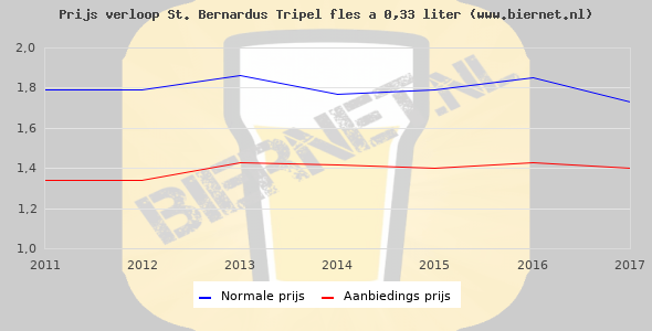 De gemiddelde prijs van een fles á 0,33 liter van St. Bernardus Tripel is €2,29 (€6,94 per liter). De gemiddelde prijs van St. Bernardus Tripel in de winkel is €8,57 per liter.