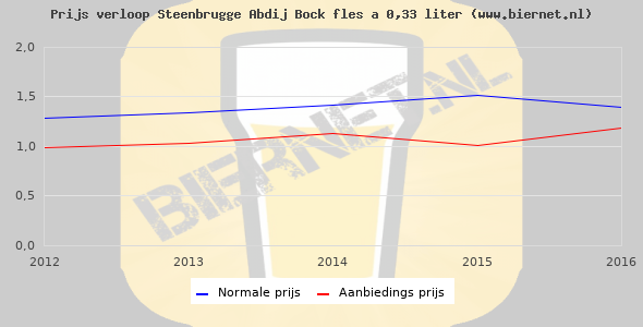 De gemiddelde prijs van een fles á 0,30 liter van Steenbrugge Abdij Bock is niet bekend. De gemiddelde prijs van Steenbrugge Abdij Bock in de winkel is niet bekend.