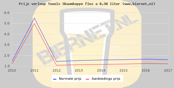 De gemiddelde prijs van een fles á 0,30 liter van Texels Skuumkoppe is €1,95 (€6,5 per liter). De gemiddelde prijs van Texels Skuumkoppe in de winkel is €5,85 per liter.