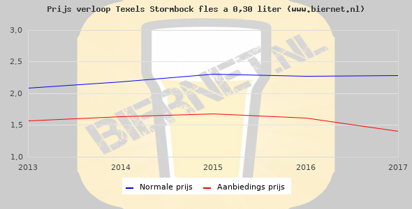 De gemiddelde prijs van een fles á 0,30 liter van Texels Stormbock is €2,4 (€8 per liter). De gemiddelde prijs van Texels Stormbock in de winkel is €8,10 per liter.