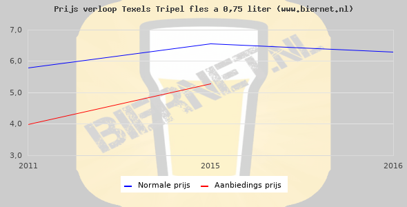 De gemiddelde prijs van een fles á 0,75 liter van Texels Tuunwal Tripel is niet bekend. De gemiddelde prijs van Texels Tuunwal Tripel in de winkel is niet bekend.
