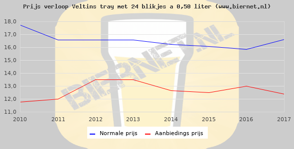 De gemiddelde prijs van een tray met 24 blikjes 0,50 liter van Veltins Pilsener is €28,56 (€2,38 per liter). De gemiddelde prijs van Veltins Pilsener in de winkel is €2,53 per liter.