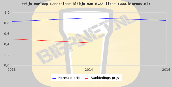De gemiddelde prijs van een blikje van 0,33 liter van Warsteiner Premium Pilsener is €1,02 (€3,09 per liter). De gemiddelde prijs van Warsteiner Premium Pilsener in de winkel is €2,76 per liter.