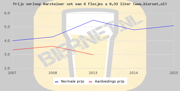 De gemiddelde prijs van een set van 6 flesjes á 0,33 liter van Warsteiner Premium Pilsener is niet bekend. De gemiddelde prijs van Warsteiner Premium Pilsener in de winkel is niet bekend.
