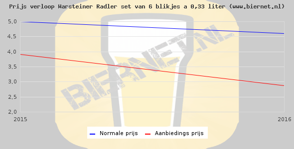 De gemiddelde prijs van een set van 6 blikjes 0,33 liter van Warsteiner Radler is niet bekend. De gemiddelde prijs van Warsteiner Radler in de winkel is niet bekend.