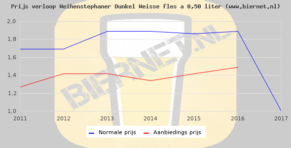 De gemiddelde prijs van een fles á 0,50 liter van Weihenstephaner Dunkel Weisse is €2,56 (€5,12 per liter). De gemiddelde prijs van Weihenstephaner Dunkel Weisse in de winkel is €5,00 per liter.