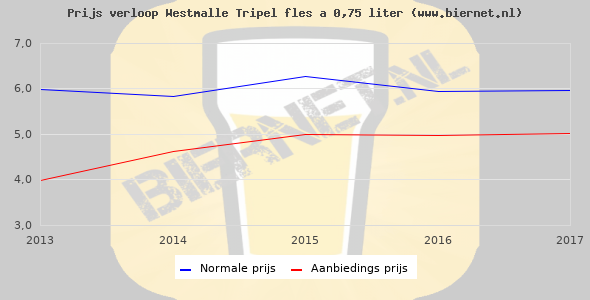 De gemiddelde prijs van een fles á 0,75 liter van Westmalle Tripel is €8,72 (€11,63 per liter). De gemiddelde prijs van Westmalle Tripel in de winkel is €7,78 per liter.