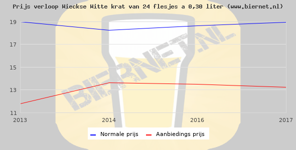 De gemiddelde prijs van een krat van 24 flesjes á 0,30 liter van Wieckse Witte is niet bekend. De gemiddelde prijs van Wieckse Witte in de winkel is niet bekend.