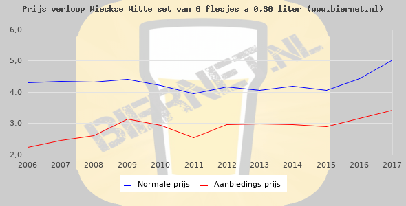 De gemiddelde prijs van een set van 6 flesjes á 0,30 liter van Wieckse Witte is niet bekend. De gemiddelde prijs van Wieckse Witte in de winkel is niet bekend.