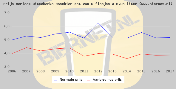 De gemiddelde prijs van een set van 6 flesjes á 0,25 liter van Wittekerke Rosebier is niet bekend. De gemiddelde prijs van Wittekerke Rosebier in de winkel is niet bekend.