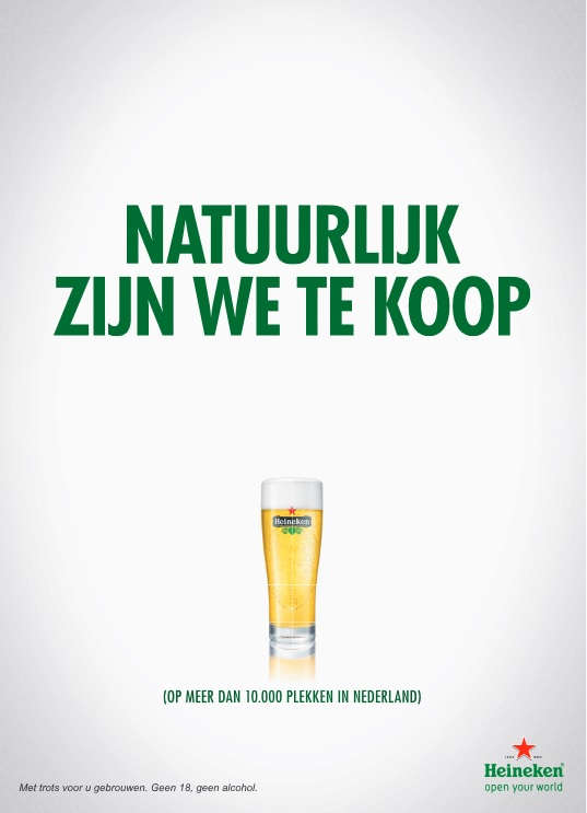 Afgelopen week was de Nederlandse brouwer in het nieuws omdat SABMiller een bod had gedaan op Heineken. Heineken haakt daar mooi op in met deze advertentie. Wel degelijk te koop, alleen niet voor bierbrouwer SABMiller! Meer reclames van Heineken Pilsener