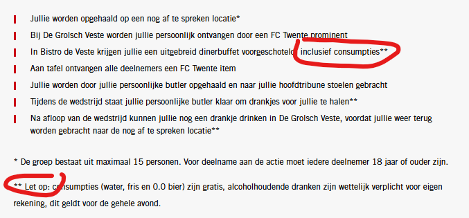 Voor een bierbrouwer die 60 jaar samenwerkt met FC Twente is dit toch een gemiste kans. Je zou verwachten dat ze trots hun eigen product in de schijnwerpers zetten. In plaats daarvan krijg je nu de bizarre situatie waarin de personal butler je komt vragen of je een 0.0% biertje wilt, terwijl het logo van Grolsch prominent op alle reclame-uitingen staat.